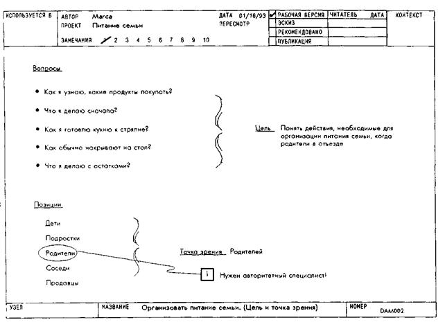 Определение цели и точки зрения модели Далее нам необходимо сформулировать цель модели "Питание семьи" и определить, с чьей точки зрения будет описан этот процесс. При выполнении этого этапа моделирования могут помочь следующие советы. 1. Составьте множество вопросов, на которые должна отвечать модель. Уточните это множество, определив, кто задает вопросы. Запишите по крайней мере 5-10 вопросов. Затем задайте степень точности ответа на каждый из них. 2. С помощью этого набора вопросов определите, как будет использоваться модель. Если вы не можете сформулировать, как она будет использоваться, попробуйте записать еще вопросы или попытайтесь вообразить, кто будет применять модель. В одном предложении сформулируйте, как она будет использоваться. Это станет целью модели. 3. Теперь решите, кто рассказывает о "Питании семьи". Составьте список кандидатов, чтобы убедиться, что вы выбрали самую подходящую точку зрения. Выберите из всех того, кто сможет ответить на большинство вопросов. Его (ее) точка зрения станет точкой зрения модели. Примечания. 1. Составление хорошего списка вопросов приводит к пониманию того, как будет использоваться модель. Чем больше вопросов, тем лучше вы поймете, о чем должна рассказать модель. 2. В качестве точки зрения модели можно выбрать точку зрения одного человека (например, отца) или нескольких (например, родителей). Помните, что каждая точка зрения выделит свои аспекты проблемы. Лучшей будет та, с которой проще всего ответить на все вопросы. Образец 1. Обратите внимание, что записано множество подробных вопросов о процессе питания семьи. Это приводит к формулировке цели модели как определения всего спектра действий, необходимых для питания семьи. 2. Цель модели включает такое подробное описание для того, чтобы подростки могли реализовать питание семью даже при невозможности проконсультироваться с родителями. 3. В образце приведено несколько вариантов точки зрения (например, точка зрения соседей). Однако была выбрана точка зрения родителей, потому что они "главные специалисты" в своем домашнем хозяйстве.