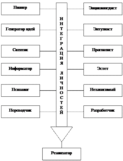 ØПрогнозист, чьей функцией в коллективном интеллекте является как можно точнее предвидеть последствия, почувствовать тенденции, просчитать все возможные варианты развития событий. ØИнформатор, который в системе коллективного интеллекта очень часто действует по принципу «обгонять, не догоняя». Он собирает и классифицирует информацию и как бы оберегает от «открытия велосипеда», повторения пройденного, он способствует поиску новых полей поиска решения проблемы. ØЭстет, ищущий изящные идеи и решения. Он может сыграть весьма конструктивную роль. Его главными критериями являются красота и гармония. Есть такое утверждение: «Концепция или решение только тогда могут быть правильными, когда они красивы». Конечно, «красота» не научное понятие, но практика жизни показывает, что это понятие не так далеко от науки, как это иногда кажется. Удачная идея или мысль всегда красива, она доставляет эстетическое удовольствие человеку. ØПсихолог – он необходим для аккумуляции определённой психологической атмосферы деятельности исследователей. При этом он занят не только решением психодиагностических задач, но призван обеспечивать определённый «дискомфортный комфорт», необходимый коллективному интеллекту. Это не только атмосфера сотрудничества, взаимопонимания и доброжелательства, но и атмосфера поиска, воодушевления, энтузиазма. ØНезависимый, который чаще всего работает и любит работать индивидуально и самостоятельно. При этом изучает чужие идеи, но ищет свои. Он работает в одиночку, но вносит существенный вклад в общую деятельность и результаты. Он часто презентует свои идеи неожиданно и при этом многих ставит в тупик, раздражает, но всё-таки заставляет задумываться и глубже вникать в проблему. ØПереводчик - это не тот человек, который владеет многими иностранными языками; иначе говоря, не владение языками делает из его переводчиком. Это человек, способный в силу своей квалификации, опыта, особенностей мышления, уровня образования, просто и доходчиво, но при этом и предельно верно объяснить проблему, решение, идею специалистам разных областей знаний. ØРазработчик, склонный доводить результаты исследований до завершающей и конкретной, практически реализуемой стадии. Это очень ценный человек в коллективном интеллекте. Есть замечательная английская пословица: «Дьявол кроется в мелочах и деталях». Действительно, иногда детали могут разрушить всю конструкцию концепции. И именно разработчикам чаще всего приходится иметь дело с деталями. ØРеализатор, «привязывающий» результаты совместной работы к конкретным условиям и добивающийся их практического применения. Перечисленные типы личностей в коллективном интеллекте не обязательно должны выступать в виде отдельного человека по каждому из этих типов. Да и людей, в чистом виде принадлежащих к тому или иному типу, в реальной жизни не существует. Эта типология может рассматриваться как комплекс функций, из которых складывается коллективный интеллект и каждая из которых, по возможности, должна быть реализована, но при этом возможны комбинация и совмещение некоторых из этих функций в одной личности. Так выглядит первый и очень важный принцип формирования коллективного интеллекта. Но он не является единственным. 2. Принцип деятельной совместности. Он является дополнением первого п