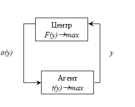 Рис. 3.1. Структура базовой организационной системы Стратегией агента является выбор действия Выбор действия у требует от агента затрат с(у), выраженных в денежной форме, и приносит центру доход Н(у). Интересы участников системы выражены их целевыми функциями (функциями полезности, предпочтения). Целевая функция агента – это разность между функцией стимулирования (количеством материальных выплат, которые он получает) и функцией затрат: