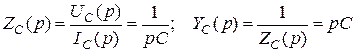 При нулевых начальных условиях (uC (0) = 0) уравнения (4.42) и (4.43) преобразуются в выражения IC (p) = pCUC (p); UC (p) = IC (p)/(pC), откуда можно найти операторные сопротивление и проводимость емкости: