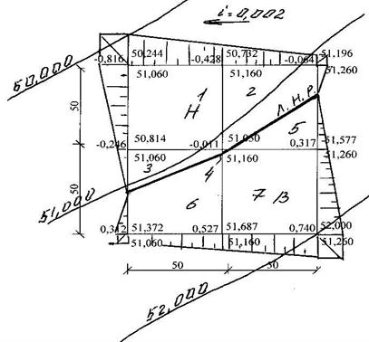 Где ∑Н1 – сумма черных отметок, принадлежащих только одному квадрату (вершины квадратных призм в углах площадки), ∑Н2 – сумма черных отметок, принадлежащих только двум квадратам и т.д.; n – количество квадратов. 5. Определение рабочих отметок вершин квадратов: