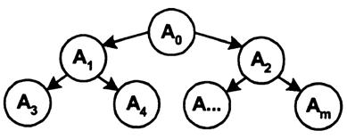 Событием называется момент завершения отдельного этапа выполнения программы или плана. Оно может быть частным результатом отдельной работы или совокупным результатом нескольких работ. Событие наступает в случае, если завершены все предшествующие ему работы. В сетевой модели выделяют исходные события (не имеют предшествующих работ и событий) и завершающие события (не имеют последующих работ и событий). На сетевом графике события изображаются кружками, а работы — стрелками. Путь — это любая последовательность работ, в которой конечное событие каждой работы совпадает с начальным событием следующей за ней работы. Полный путь — это любой путь, начало которого совпадает с исходным событием сети, а конец — с завершающим. Наиболее продолжительный полный путь называют критическим путем. Работы и события, находящиеся на этом пути, называются критическими. При решении сложных задач либо комплексов задач одни и те же типовые операции могут использоваться в различных комбинациях. Граф алгоритма решения задачи может быть представлен как древовидный граф, событиями (узлами) которого являются соответствующие операции над данными, а работами — связи между отдельными операциями. На рис. 2.1 приведен граф расчета алгоритма решения задачи. В корне графа расположена начальная операция (А0), от которой, после ее выполнения, происходит переход к операциям А1 или аз, а затем - операциям А3, А4... Аm. Число обращений к каждой операции может быть различным.