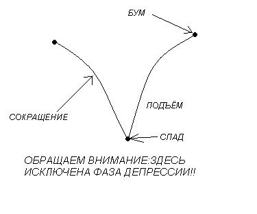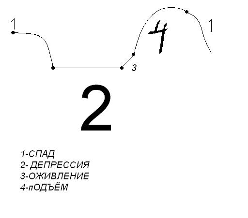 Я фаза ОЖИВЛЕНИЕ Я фаза ДЕПРЕССИЯ. Наступает после и может иметь длительный характер. Однако уровень производства стабилен, но низок по отношению к докризисному состоянию. Высокий уровень безработицы сохраняется, и стабилизируются запасы товарные. Незначительное повышение уровня производства и некоторое сокращение безработицы, начинают расти цены, растетё ссудный процент. На товарном рынке растёт спрос на новое оборудование, наметившееся оживление охватывает все большее количество отраслей,начинают расти инвестиции. Зачастую приобретает ажиотажный характер, при этом уровень производства доходит до пред.цикла, лихорадочно растут цены, сокращается безработица растёт заработная плата на этой фазе редко растёт спрос на продукцию отраслей обеспечивающих НТП. На фазе роста усиливаются диспропорции, заложенные ещё на фазе оживления, и экономика вновь походит к следующему витку.