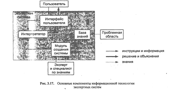 Под искусственным интеллектом обычно понимают способности компьютерных систем к таким действиям, которые назывались бы интеллектуальными, если бы исходили от человека. Чаще всего здесь имеются в виду способности, связанные с человеческим мышлением. Работы в области искусственного интеллекта не ограничиваются экспертными системами. Они также включают в себя создание роботов, систем, моделирующих нервную систему человека, его слух, зрение, обоняние, способность к обучению. Решение специальных задач требует специальных знаний. Однако не каждая компания может себе позволить держать в своем штате экспертов по всем проблемам, связанным с ее работой проблемам или даже приглашать их каждый раз, когда проблема возникла. Главная идея использования технологии экспертных систем заключается в том, чтобы получить от эксперта знания и, загрузив их в память компьютера, использовать всякий раз, когда в этом возникнет необходимость. Являясь одним из основных приложений искусственного интеллекта, экспертные системы представляют собой компьютерные программы, трансформирующие опыт экспертов в какой-либо области знаний в форму эвристических правил (эвристик). Эвристики не гарантируют получения оптимального результата с такой же уверенностью, как обычные алгоритмы, используемые для решения задач в рамках технологии поддержки принятия решений. Однако часто они дают в достаточной степени приемлемые решения для их практического использования. Все это делает возможным использовать технологию экспертных систем в качестве советующих систем. Сходство информационных технологий, используемых в экспертных системах и системах поддержки принятия решений, состоит в том, что обе они обеспечивают высокий уровень поддержки принятия решений. Однако имеются три существенных различия. Первое связано с тем, что решение проблемы в рамках систем поддержки принятия решений отражает уровень ее понимания пользователем и его возможности получить и осмыслить решение. Технология экспертных систем, наоборот, предлагает пользователю принять решение, превосходящее его возможности. Второе отличие указанных технологий выражается в способности экспертных систем пояснять свои рассуждения в процессе получения решения. Очень часто эти пояснения оказываются более важными для пользователя, чем само решение. Третье отличие связано с использованием нового компонента ИТ - знаний. Основные компоненты. Основными компонентами информационной технологии, используемой в экспертной системе, являются (рис. 7): интерфейс пользователя, база знаний, интерпретатор, модуль создания системы.