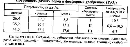 Примечание. Сильной потребностью обладают семечковые, плодовые, розы, ольха; средней — косточковые, лиственные, подвои, хвойные; слабой — тополя и ивы.