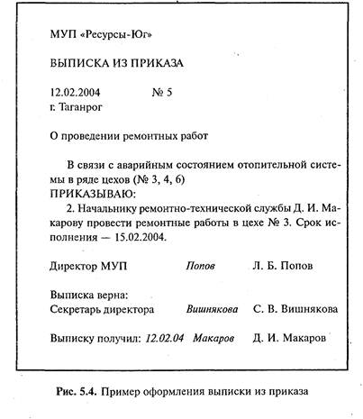 Методические рекомендации При изучении данной темы необходимо обратить особое внимание на состав реквизитов документов, требования к их расположению, оформлению, а также структуру текста. Приказ - широко применяемый в управлении правовой распорядительный документ, издаваемый на правах единоначалия руководителем организации, учреждения, ведомства в целях решения возникающих в процессе деятельности как текущих (оперативных), так и перспективных задач. Приказ является одним из видов распорядительных документов, составляющих систему распорядительной документации, в состав которой наряду с приказом входят такие документы, как постановления, указания, решения, распоряжения. Приказы подразделяются на две группы: приказы по основной (производственной) деятельности и приказы по личному составу (персоналу) организации. Приказы по основной деятельности оформляются на специальном, заранее заготовленном бланке, - бланке приказа (рис. 2.8) или на общем бланке организации с указанием вида документа - ПРИКАЗ (рис. 2.4). Текст приказа, как правило, состоит из двух частей: констатирующей и распорядительной. В констатирующей части излагаются основания, причины, побудившие руководителя организации издать данный приказ, указываются цели и задачи приказа. Возможен вариант приказа без констатирующей части, если поручаемые действия не требуют особого пояснения, являются очевидными. Распорядительная часть документа начинается со слова ПРИКАЗЫВАЮ (без кавычек), печатаемого с новой строки от левого поля бланка прописными буквами. После слова ПРИКАЗЫВАЮ ставится двоеточие. Поскольку приказ зачастую предусматривает несколько разнохарактерных действий, то его распорядительная часть делится на пункты, а иногда и на подпункты. Каждый пункт начинается с указания в дательном падеже ответственного должностного лица, структурного подразделения или организации, затем в сжатой, повелительной форме излагаются предписываемые действия и указываются сроки исполнения мероприятий. Последним пунктом приказа назначается должностное лицо, структурное подразделение или организация, которым вменяется контроль над исполнением приказа. Макет построения приказа приведен ниже (рис. 5.1). Примеры оформления приказов даны на рис. 5.2, 5.3. Зачастую ответственному исполнителю для выполнения работы не требуется полный текст приказа. В этом случае в практике документирования делается выписка из него. По составу реквизитов и оформления выписка не отличается от самого приказа. В выписке лишь следует уточнить название документа: вместо слова ПРИКАЗ приводятся слова ВЫПИСКА ИЗ ПРИКАЗА. Вместо полного текста приказа печатается та его часть (пункт, подпункты), которая касается непосредственно конкретного исполнителя. Выписка из приказа может быть напечатана (с помощью ПК, пишущей машинки) на чистом листе бумаги формата А 4, А 5 в угловом варианте расположения постоянных реквизитов флаговым способом (см. рис. 5.4). Выписка заверяется секретарем-референтом (секретарем) и выдается ответственному исполнителю под расписку.