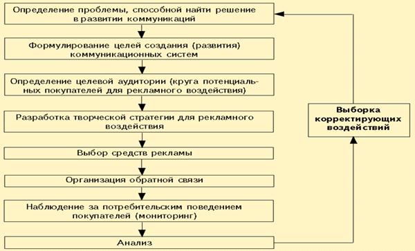 Уже отмечалось, что сама по себе реклама или даже рекламная кампания не могут быть сколько-нибудь эффективными без четко налаженного двустороннего информационного взаимодействия продавцов и покупателей, без того, что принято называть внешними коммуникациями. Поскольку одна рекламная кампания не может быть похожа на предыдущую, то вполне обоснованным является постоянное планирование коммуникационных систем (или корректировка прежних). Другими словами, планирование коммуникаций можно назвать итеративным процессом, т. е. повторяющимся периодически в зависимости от изменения некоторых обстоятельств — совершенствования потребительных свойств рекламируемого товара, что меняет содержание рекламы, соотношение сил конкурирующих организаций на одном и том же рынке, уровень цен на аналогичные товары и др. Как только появляются подобные обстоятельства, так сразу же возникает острая необходимость менять рекламную политику, а следовательно, содержание рекламных обращений, структуру рекламной компании, а также структуру всей коммуникационной системы. В общем и целом весь процесс планирования коммуникаций можно представить в виде укрупненной схемы (рис.10).