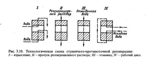 R2/Ca2+ +nNa+ ↔2R/Na++Ca2+ +(n-2)Na+ (4) R2/Mg2+ +nNa+ ↔2R/Na++Mg2+ +(n-2)Na+ (5) где п —избыток NaCl против его стехиометрического количества. Так как для регенерации используют технические реагенты, содержащие посторонние примеси (в нашем случае Са2 + и Mg2+), то хорошо отрегенерировать фильтр не удается. Кроме того, качество регенерации существенно зависит от проявления так называемого противоионного эффекта. При ограниченном расходе соли на регенерацию лучше будут отрегенерированы участки слоя катионита, встречающиеся со свежим раствором. По мере прохождения раствора в глубь слоя условия регенерации будут ухудшаться вследствие повышения концентрации ионов Са2+ и Mg2+ в регенерационном растворе и его обеднения по ионам Na +. Это явление носит название противоионного эффекта. Такой эффект возникает и в процессе умягчения исходной воды. Регенерацию ионита можно проводить несколькими способами, которые отличаются друг от друга сочетанием направления потока регенерационного раствора и воды. Если регенерационный раствор проходит слой ионита в том же направлении, что и поток воды, то это прямоточная регенерация. Такая регенерация создает самые невыгодные условия для процесса умягчения, так как при этом особенно хорошо регенерируется первый по ходу воды верхний участок слоя и плохо нижний слой ионита (рис. 3.6, а), поэтому на выходе из слоя катионита умягчаемая вода, в которой резко понижена концентрация ионов жесткости, проходит через участки плохо отрегенерированного катионита и, следовательно, не может глубоко умягчаться. Более того, это обстоятельство может привести в начале цикла даже к переходу некоторой части ионов жесткости из катионита в воду. При противоточной регенерации регенерационный раствор подается в направлении, противоположном направлению