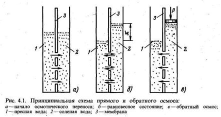 При разделении воды и растворенных в ней примесей требуются затраты энергии не менее определенного минимального ее количества, равного необходимому (согласно термодинамическому расчету) для обратимого отделения воды. Минимальная энергия, требующаяся для обратимого переноса I моля воды через мембрану, например, при разделении морской воды, оценивается 45,2 Дж/моль, или 0,58 кВт•ч/моль. Это значение получено термодинамическим расчетом, и поэтому оно справедливо для любых процессов разделения морской воды. Однако при затрате минимального значения свободной энергии скорость разделения раствора практически равна нулю. Поскольку в реальных процессах производительность установок должна быть технологически приемлемой, то и рабочее давление в них должно значительно превосходить осмотическое. Обычно рабочее давление поддерживается в интервале 5—8 МПа. В растворах, содержащих высокомолекулярные вещества с максимальным диаметром частиц 0,5 мкм (или молекулярной массой не более 500), осмотическое давление пренебрежимо мало. Для их разделения применяют процесс ультрафильтрации на специальных мембранах, пропускающих лишь воду, ионы и молекулы низкомолекулярных соединений. В этом случае рабочее давление в аппарате не превышает 0,5 МПа. Обратный осмос и ультрафильтрация принципиально отличны от процессов фильтрования, так как при их осуществлении образуется не осадок, как при фильтровании, а лишь два раствора с разными концентрациями примесей.