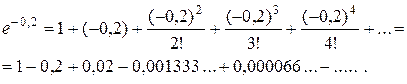 Разложения (24) – (28) и им подобные широко используются как для приближенного вычисления значений стоящих слева функций с любой заданной точностью, так и для различных математических операций с указанными функциями. Пример 4. Вычислить Решение. Используя разложение (24) при х = - 0,2, получим: