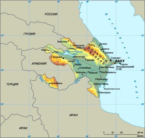 Более половины территории Азербайджана занимают горы, относящиеся к системе Большого Кавказа на севере (хребты Большой Кавказский с вершиной Базардюзю, 4480 м, и Боковой с вершиной Шахдаг, 4250 м) и Малого Кавказа на западе и юго-западе. На крайнем юго-востоке находятся Ленкоранские горы, состоящие из трех параллельных хребтов. Главная вершина самого высокого Талышского хребта Кёмюркёй достигает 2477 м. Горы Большого и Малого Кавказа разделяет обширная Кура-Араксинская низменность. К северо-востоку от Большого Кавказа расположена Кусарская равнина. Низменные Апшеронский п-ов и Куринская коса глубоко вдаются в Каспийское море.