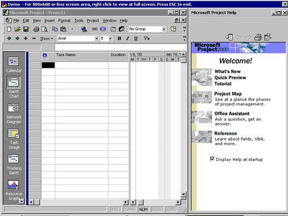 Трехфазная система управления проектами. Три этапа работы над проектом В работе над каждым проектом можно выделить три основных этапа: · Построение плана проекта. · Наблюдение за ходом выполнения и управление проектом. · Завершение проекта. Построение первоначального плана (baseline plan) проекта — это творческая работа, выполняемая, в основном, руководителем проекта. Microsoft Project 2000 и Project Central предоставляют инструментарий, позволяющий выполнить эту работу наилучшим образом. Еще до начала работы над проектом в системе Project 2000 руководитель проекта, возможно совместно с заказчиками проекта, вырабатывает систему наблюдаемых параметров — осязаемых и измеряемых результатов, необходимых для завершения проекта или его частей (deliverables, в терминах Project 2000). Такими результатами могут быть, например, отчет о возможных рынках сбыта продукта, опытный образец продукта. Эти осязаемые результаты и становятся задачами проекта. Когда у руководителя сложится представление о целях проекта, возможном разбиении его на задачи, выделяемых ресурсах, он может начинать работать с системой Project 2000. 1. Прединвестиционная – анализ инвестиционных возможностей, предварительное технико - экономическое обоснование (ТЭО) 2. Инвестиционная – контракты, проектирование, реализация объекта проектирования, выполнение всех работ, предварительный маркетинг, обучение персонала. 3. Эксплуатационный – приемка и запуск объекта, замена оборудования. Внедрение инноваций. Расширение. Каждая фаза проекта завершается достижением конкретного результата. Можно выделить следующие шаги, которые следует выполнить на этапе составления первоначального плана: · Открытие проекта. · Планирование задач · Планирование ресурсов · Оценка стоимости проекта (бюджета). · Планирование критериев качества и рисков. · Определение способов коммуникации и обеспечение безопасности. · Оптимизация плана. · Сохранение плана и доведение его до исполнителей. Создание нового проекта в Project 2000 начинается с традиционных для всех приложений Microsoft шагов — выбора пункта New из головного меню File. На рис. 1 показано основное окно приложения Project 2000 в начальный момент работы. Рис. 1. Основное окно Project 2000 в начальный момент работы