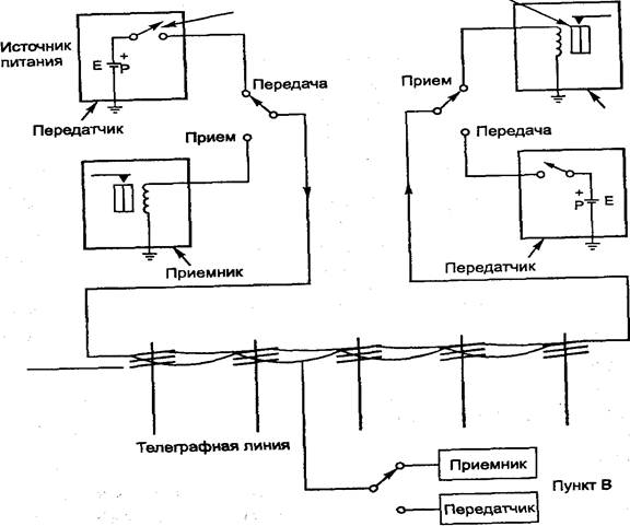 Рис. 1.2. Принцип работы телеграфной связи Впервые Морзе испытал телеграф в 1832 году, но самая известная демонстрация состоялась в 1844 году, когда Морзе из Вашингтона в Балтимор передал по проводу сообщение «What hath God wrought!» («Чудны дела твои, Господи!»). До изобретения телеграфа обычным способом связи была почта Pony Express, поэтому более быстрый телеграф сразу же стал пользоваться успехом. Оборудование было простым и надежным; ключ и клопфер содержали только по одной подвижной детали. Сильной и в то же время слабой стороной телеграфа, а также единственной действительно сложной его частью являлся человеческий мозг, другими словами, работоспособность операторов, осуществлявших передачу и прием. К началу Гражданской войны телеграфные линии уже охватили весь континент, пересекая прерии и пустыни и соединяя Калифорнию с остальной частью Соединенных Штатов. Пока не изобрели телефон, что произошло примерно 30 лет спустя, телеграфная индустрия была одной из самых больших и процветающих. Такого рода услуги предоставлялись почти в каждом городе США. Прокладка трансатлантического кабеля между США и Францией в 1866 году положила начало созданию международной телеграфной связи.