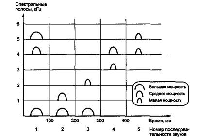 Рис. 16. Пример распределения энергии в частотных спектрах: 1 — гласная; 2 — гласная; 3 — гласная; 4 — звонкая согласная; 5 — глухая согласная