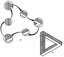 Что получилось? Оказывается, эти фрагменты не вполне соединимы; подобной фигуры на самом деле не бывает. Однако в совокупности линий и углов, образующих эту фигуру — так называемый треугольник Пенроу­за, нет ничего противоестественного. В данном случае интерпретация отдельных фрагментов противоречит интерпретации целого.