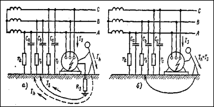 а) - при наличии заземлении; б) - при отсутствии заземления. Напряжение на корпусе электроустановки при наличии заземления будет равно Uк=Iз *Rз , При прикосновении человека к корпусу только часть тока замыкания на землю будет проходить через тело человека, т. е. ток через тело человека зависит от тока замыкания на землю: Ih = f(Iз). Если человек касается незаземленного корпуса, оказавшегося под напряжением, то через человека проходит весь ток замыкания на землю Ih = Iз. Возможные последствия однофазного прикосновения. Во всех случаях контур тока Ih замыкается либо через сопротивления утечки Zф (в сетях, изолированных от земли), либо через сопротивление заземления нейтрали источника электроэнергии R0.