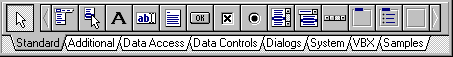 Рис.3: Палитра Компонент - место, где Вы выбираете объекты, которые будут помещены на вашу форму. Предположим, Вы помещаете компонент TEdit на форму; Вы можете двигать его с места на место. Вы также можете использовать границу, прорисованную вокруг объекта для изменения его размеров. Большинством других компонент можно манипулировать тем же образом. Однако, невидимые во время выполнения программы компоненты (типа TMenu или TDataBase) не меняют своей формы.