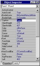 Инспектор Объектов состоит из двух страниц, каждую из которых можно использовать для определения поведения данного компонента. Первая страница - это список свойств, вторая - список событий. Если нужно изменить что-нибудь, связанное с определенным компонентом, то Вы обычно делаете это в Инспекторе Объектов. К примеру, Вы можете изменить имя и размер компонента TLabel изменяя свойства Caption, Left, Top, Height, и Width. Рис.4: Инспектор Объектов позволяет определять
