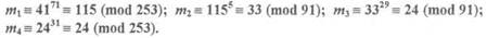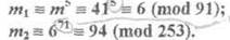 1. Пусть банкир В выбирает простые числа 7 и 13, вкладчик W выбирает простые числа 11 и 23, таким образом, R = 91 = =7*13 и r = 253 = 11 * 23. Пусть 5 и 31 - открытые ключи банкира и вкладчика, а 29 и 71 - секретные ключи банкира и вкладчика соответственно. И в самом деле, 5 • 29 = 1 (mod 72), 31 * 71 = 1 (mod 220). Тогда открытая телефонная книжка имеет вид: