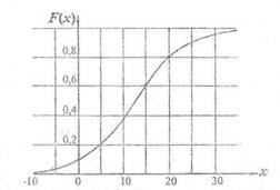 Пример. Статистика последних 3 лет свидетельствует о том, что месячная прибыль фирмы (тыс. долл.) является случайной величиной, которая описывается функцией распределения, изображенной на рисунке. По виду графика оценить: 1) вероятность того, что прибыль произвольно взятого месяца будет заключена в пределах от 15 до 25 тыс. долл.; 2) вероятность того, что прибыль произвольно взятого месяца будет не менее 20 тыс. долл.; 3) вероятность того, что в произвольно взятом месяце будут убытки.