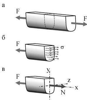 Прежде чем перейти к исследованию внутренних усилий и напряжений, возникающих в растянутом стержне, рассмотрим некоторые гипотезы, связанные с характером деформирования такого стержня и имеющие в сопротивлении материалов исключительно важное значение. Принцип Сен-Венана: в сечениях, достаточно удаленных от мест приложения сил, распределение напряжений и деформаций мало зависит от способа приложения нагрузок. Принцип Сен-Венана дает возможность вести расчет без учета местных (локальных) деформаций, возникающих вблизи от точек приложения внешних сил (см. рисунок) и отличающихся от деформаций основного объема материала, что в большинстве случаев упрощает решение задачи. Гипотеза плоских сечений (гипотеза Я. Бернулли): поперечные сечения стержня плоские и перпендикулярные его оси до деформации остаются плоскими и перпендикулярными оси и после деформации (см. рисунок). Используя метод мысленных сечений, определим внутренние усилия в растянутом стержне: а) стержень, нагруженный растягивающими силами F и находящийся в равновесии, рассекаем произвольным сечением;