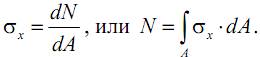Проецируя внешнюю силу F, действующую на отсеченную часть стержня, на другие оси (y и z), а также составляя уравнения моментов относительно координатных осей, легко убедится, что осевое усилие N является единственным внутренним усилием, возникающим в сечении стержня (остальные тождественно равны нулю). Таким образом, при растяжении (сжатии) из шести внутренних усилий в сечении стержня возникает только одно – осевое усилие N. Нормальные напряжения σx, возникающие в сечении стержня, связаны с осевым усилием N следующим образом: