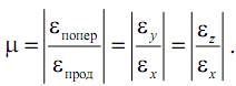 Между поперечной и продольной относительной деформациями при растяжении (сжатии) в пределах применимости закона Гука существует постоянное соотношение, которое называется коэффициентом поперечных деформаций (коэффициентом Пуассона µ). Коэффициент Пуассона равен абсолютной величине отношения поперечной деформации к продольной