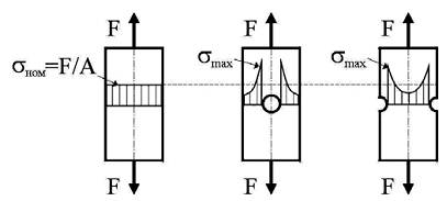Равномерное распределение напряжений по сечению растянутого стержня сохраняется только в случае, если сечения стержня остаются постоянными по его длине. Резкие изменения площади поперечного сечения вследствие наличия поперечных отверстий, выточек, канавок, надрезов приводят к неравномерному распределению напряжений (вызывают концентрацию напряжений) и называются концентраторами напряжений.