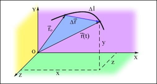 Положение материальной точки задают радиусом-вектором . При движении материальной точки ее радиус-вектор меняется в общем случае как по модулю, так и по направлению, т. е. радиус-вектор зависит от времени t:(t)