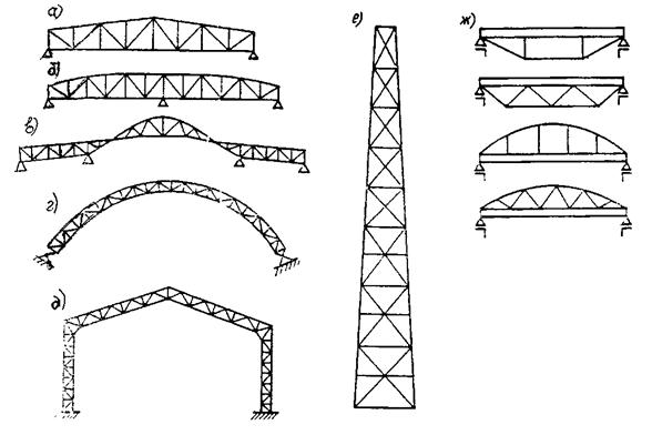 а – треугольная; б – треугольная с дополнительными стойками; в – раскосная с восходящими раскосами; г – раскосная с нисходящими раскосами; д – шпренгельная; е – крестовая; ж – перекрестная; и – ромбическая; к - полу раскосная