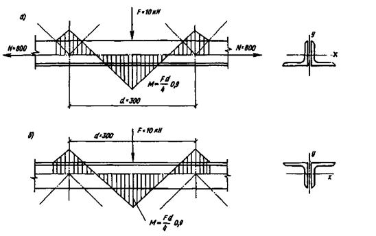 Пример 9.3. Подобрать сечение растянутого нижнего пояса при действии на него внеузловой нагрузки в середине длины панели (рис.9.13, а) F=10кН. Осевое усилие в поясе N=800кН. Расстояние между центрами узлов d=3м. Материал конструкции – сталь С245;Ry=24кН/см2. Коэффициент условий работы γс=0,95.
