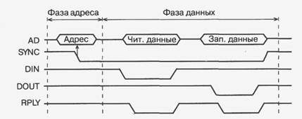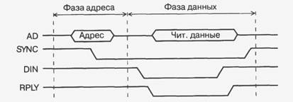 В фазе данных цикла чтения (рис. 2.3) процессор выставляет сигнал строба чтения данных -DIN, в ответ на который устройство, к которому обращается процессор (исполнитель), должно выставить свой код данных (читаемые данные). Одновременно это устройство должно подтвердить выполнение операции сигналом подтверждения обмена -RPLY. Для сигнала -RPLY используется тип выходного каскада ОК, чтобы не было конфликтов между устройствами-исполнителями. Процессор, получив сигнал -RPLY, заканчивает цикл обмена. Для этого он снимает сигнал -DIN и сигнал -SYNC. Устройство-исполнитель в ответ на снятие сигнала -DIN должно снять код данных с шины AD и закончить сигнал подтверждения -RPLY. После этого процессор снимает сигнал -SYNC. В фазе данных цикла записи (рис. 2.4) процессор выставляет на шину AD код записываемых данных и сопровождает его отрицательным сигналом строба записи данных -DOUT. Устройство-исполнитель должно по этому сигналу принять данные от процессора и сформировать сигнал подтверждения обмена -RPLY. Процессор, получив сигнал -RPLY, заканчивает цикл обмена. Для этого он снимает код данных с шины AD и сигнал -DOUT. Устройство-исполнитель в ответ на снятие сигнала DOUT должно закончить сигнал подтверждения -RPLY. После этого процессор снимает сигнал -SYNC. То есть на данной магистрали адрес передается синхронно (без подтверждения его получения исполнителем), а данные передаются асинхронно, с обязательным подтверждением их выдачи или приема исполнителем. Отсутствие сигнала подтверждения -RPLY в течение заданного времени воспринимается процессором как аварийная ситуация. В принципе возможна и асинхронная передача адреса, что увеличивает надежность обмена, хотя может снижать его скорость. Помимо циклов чтения и записи на магистрали Q-bus используются также и циклы типа «ввод-пауза-вывод» («чтение-модификация-запись»). Упрощенная временная диаграмма этого цикла представлена на рис. 2.5.