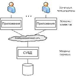 Утилиты Утилиты – программы, разработанные для АБД и используемые им при решении различных административных задач. Некоторые утилиты выполняются на внешнем уровне системы и потому представляют собой не что иное, как приложения специального назначения (инструментальные средства). Они могут быть созданы не только поставщиком СУБД, но и сторонними разработчиками программного обеспечения. Однако другие утилиты выполняются на внутреннем уровне (т.е. являются частью сервера) и потому должны предоставляться поставщиком СУБД. Приведем некоторые из утилит различных типов, часто применяемых на практике: § Инструменты загрузки. Применяет для создания исходной версии базы данных из одного или более файлов операционной системы. § Инструменты выгрузки-перезагрузки. Служат для создания резервных копий хранимых данных и восстановления базы данных из этих копий. § Инструменты реорганизации. Применяются для перераспределения данных в хранимой базе данных, которое выполняется по различным причинам (обычно для повышения производительности). § Статистические инструменты. Применяются для вычисления различных статистических показателей и показателей производительности, например, сведений о размерах файлов или значениях данных, счетчики операций ввода-вывода и т.п. § Инструменты анализа. Используются для анализа данных, собранных статистическими инструментами. Помимо приведенных классов утилит существует множество других, облегчающих АБД выполнение своих функций. Ранее уже упоминалось о возможности организации «распределенной обработки», используя коммуникационную сеть. Взаимодействие между различными машинами осуществляется с помощью специального программного обеспечения, предназначенного для управления сетью. Оно может быть некоторым расширением менеджера передачи данных, но чаще всего является отдельным программным компонентом. Распределенная обработка может быть самой разнообразной и осуществляться на разных уровнях. В самом простейшем случае сервер СУБД запускается на одной машине, а клиент – на другой (см. рис. 1.5а). Существует множество аргументов в пользу данной архитектуры: § Возможность организации параллельной обработки. Поскольку сервер и клиент запускаются на разных машинах, то они работают параллельно, тем самым снижая нагрузку на сервер. В результате время реакции системы на запрос и ее производительности должны улучшиться. § Специализация машин. Машина сервера может быть изготовлена по специальному заказу и специально приспособлена для работы с СУБД. Такое решение позволяет дополнительно повысить производительность СУБД. Машина клиента также может представлять рабочую станцию, приспособленную к потребностям конечного пользователя, что позволяет предоставить ему наиболее удобный интерфейс и гарантировать высокий уровень готовности, быструю реакцию системы и другие дополнительные удобства при использовании. § Возможность разделения БД. Данная модель может быть использована и для многопользовательских СУБД, когда к машине сервера могут иметь доступ несколько разных клиентов одновременно (см. рис. 1.5б). Дальнейшим развитием данной модели является вариант, когда машины могут выступать и как клиенты, и как серверы (см. рис. 1.5в). Данная модель хорошо соответствует принципам работы крупных орга