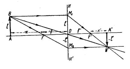 Рис. 17.6. Построение изображения, создаваемого тонкой (положительной) линзой.