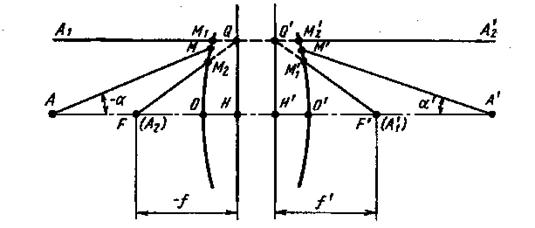 Лучу АМ соответствует сопряженный с ним луч М`A`. Плоскость, перпендикулярная оптической оси, проходящая через точку F` называется задней фокальной плоскостью. Она сопряжена с бесконечно удаленной плоскостью предметов. Точка F – передний фокус оптической системы. Через нее проходит передняя фокальная плоскость. Плоскость QН называют передней главной плоскостью, а плоскость Q`H` - задней главной плоскостью. Точки F и F`, а также H и H` называют кардинальными (основными). Лучи, которые условно считают преломляющимися не на реально существующих поверхностях линзы, а на главных плоскостях, называют нулевыми лучами.
