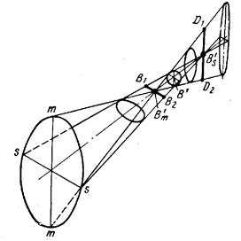 Явление астигматизма заключается в том, что лучи одного и того же пучка после преломления линзой собираются не в точку, а в прямые линии. Пространственная картина астигматического изображения показана на рисунке.