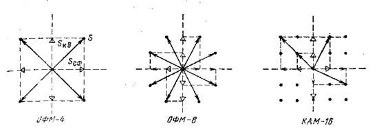 В ЦРРЛ и ВЛС, в которых информация передается со скоростью 140 Мбит/с и более, как правило, модуляция несущей осуществляется с помощью двух- или четырехпозиционной относительной фазовой манипуляции (ОФМ-2 и ОФМ-4). Применяемые в аппаратуре этих линий связи модуляторы и демодуляторы могут быть использованы для реализации других видов модуляции несущей, известных в последнее время. Такими являются амплитудно-фазовая (АФМ) и модуляция с минимальным сдвигом фазы (ММФ), которые позволяют в первом случае увеличить объем передаваемой информации при сохранении неизменной скорости передачи, и во втором – улучшить характеристики детектирования в каналах с ограничением по сравнению с обычной ОФМ-4. Для ЦССС с временным разделением каналов использование высокоскоростного цифрового сигнала (500 Мбит/с) позволяет осуществить передачу информации пакетами, применяя четырехпозиционную фазовую модуляцию несущей.