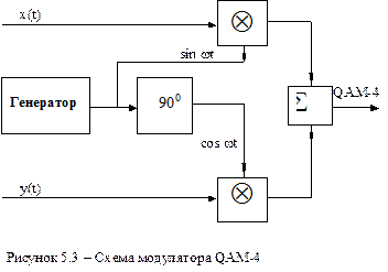 На рис. 3 показана структурная схема модулятора, а на рис. 4 – сигнальное созвездие для случая, когда x(t) и y(t) принимают значения ±1, ±3 (QAM-4).