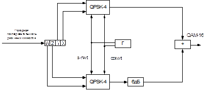 Величины ±1, ±3 определяют уровни модуляции и имеют относительный характер. Созвездие содержит 16 сигнальных точек, каждая из которых соответствует четырем передаваемым информационным битам. Комбинация уровней ±1, ±3, ±5 может сформировать созвездие из 36 сигнальных точек. Однако из них в протоколах ITU-T используется только 16 равномерно распределенных в сигнальном пространстве точек. Существует несколько способов практической реализации QAM-4, наиболее распространенным из которых является так называемый способ модуляции наложением (SPM). В схеме, реализующей данный способ, используются два одинаковых QPSK (рис. 5). Используя эту же методику получения QAM, можно получить схему практической реализации QAM-32 (рис. 6).