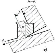 Координатные плоскости и действительные углы Для определения действительных углов режущего лезвия, параметров сечения срезаемого слоя используются следующие координатные плоскости [1]: основная плоскость, рабочая плоскость, плоскость резания и плоскость стружкообразования. Основная плоскость перпендикулярна скорости действительного главного движения. Для строгания (см. рис. 2.2) основной плоскостью будет ZOX. Рабочая плоскость содержит векторы скорости резания v и подачи s (см. рис. 2.1, 2.2). Плоскость резания проводится через режущую кромку и скорость резания v (см. рис. 2.2). Если режущая кромка криволинейная, то плоскость резания касается режущего лезвия в рассматриваемой точке. Плоскость стружкообразования (для всей стружки) проходит через перпендикуляр к режущей кромке в плоскости резания и через вектор схода стружки v1. В данной точке режущей кромки (для элементарного участка стружки шириной Db) плоскость стружкообразования перпендикулярна режущей кромке. Действительные углы режущего лезвия:угол в плане, задний угол, угол наклона режущей кромки и передний угол – определяются, соответственно, в основной плоскости, рабочей плоскости, плоскости резания и плоскости стружкообразования [1].В основной плоскости измеряютуглы в плане и радиус r закругления вершины (рис. 2.8, а). Действительный угол в плане j измеряют в основной плоскости между проекцией режущей кромки и рабочей плоскостью (рис. 2.8, а). Действительный задний угол a измеряют в рабочей плоскости (рис. 2.8, б) как угол между задней поверхностью и направлением вектора скорости движения резания. В плоскости резания измеряют угол наклона режущей кромки l (рис. 2.8, г) между режущей кромкой и основной плоскостью. Положительным считается угол l, если вершина резца – самая низкая точка режущей кромки [1]. При фрезеровании цилиндрической фрезой (рис. 2.9) угол l наклона режущей кромки является углом наклона винтового зуба. Соответственно, для прямозубой фрезы угол l равен нулю.