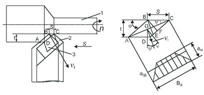 Действительная толщина срезаемого слоя aд измеряется в основной плоскости в направлении скорости стружки v1, т.е. перпендикулярно диагонали сечения срезаемого слоя. Поскольку в направлении скорости v1 расстояние между ломаными линиями АВС и ADC переменно, то и действительная толщина срезаемого слоя может быть переменной по ее ширине (рис. 2.10). Эпюра изменения действительной толщины срезаемого слоя имеет вид трапеции, а при равных длинах главной и вспомогательной режущих кромок – треугольника. При прямоугольном резании (l=0) и выполнении условия (2.10) толщина срезаемого слоя приближенно оценивается статической толщиной срезаемого слоя ас=BF, измеренной в направлении нормали к проекции главной режущей кромки: