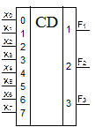 а) б) Рис.3 Обычно входы нумеруются по порядку, а на выходах обозначаются вес разрядов. Двоичная кодовая комбинация на выходах соответствует номеру входа, на который подается 1. Логика работы трехразрядного шифратора представлена в виде таблицы на рис.3б. В таблице приведены не все наборы входных переменных, т.к. шифратор по определению требует 1 только на одном входе. Булевы функции для каждого выхода шифратора запишем исходя из очевидных логических связей между входами и выходами. Выходная переменная F3 должна быть равна 1, когда или х4 = 1, или х5 = 1, или х6 = 1, или х7 = 1. Таким образом