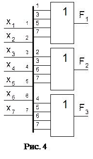 Можно показать, что если бы составить таблицу истинности шифратора со всеми возможными наборами входных переменных, записать по ней булевы функции для выходов F1, F2, F3, провести их минимизацию с учетом факультативных условий, то можно получить те же выражения (3). Схема шифратора, построенная по булевым функциям (3) приведена на рис.4.