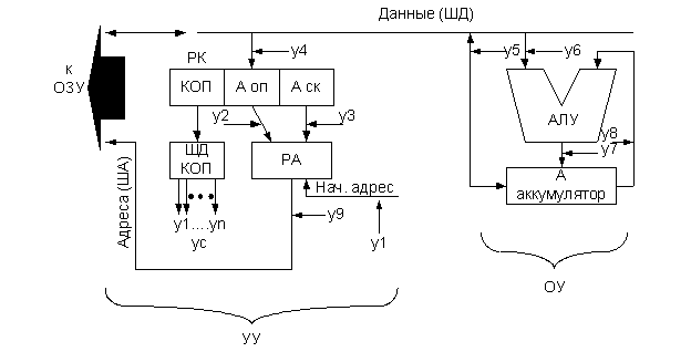 Рисунок 2.4.1- Структура процессора с принудительной адресацией Процесс выполнения команд процессором следующий: в начальный момент в регистр команд (РК) заносится адрес первой выполняемой команды (по сигналу “Сброс” или “Пуск” или каким либо иным способом). По этому адресу считываются команда, которая содержат код операции (КОП), адрес операнда (Аоп), а так же адрес следующей команды (Аск). Поле КОП команды поступает на схему формирования управляющих сигналов (ДшКОП- дешифратор КОП) которая вырабатывает нужную последовательность управляющих сигналов y1...yn, необходимых для выполнения команды в процессоре. Адрес операнда через РА задает номер ячейки ОП, в которой он хранится. Операнд, считанный из ячейки памяти с заданным адресом, поступает на обработку в АЛУ. Рассмотрим следующий пример. Положим, что процессор имеет следующую систему команд в машинных кодах (для более краткой записи представим ее в шестнадцатеричной системе счисления): 01H- вызов операнда из ОЗУ в аккумулятор; 02H- запись содержимого А в ОЗУ; 1АH - команда сложения; 00H – остановка выполнения программы. Пусть необходимо составить программу сложения 2-х чисел, находящихся в ячейках ОЗУ с адресами 0841H и 0842H и записать результат в ячейку 0843H. Программа хранится в ячейках памяти с начальным адресом 1300H. Ширина выборки команд и данных из ОЗУ - 1 байт.