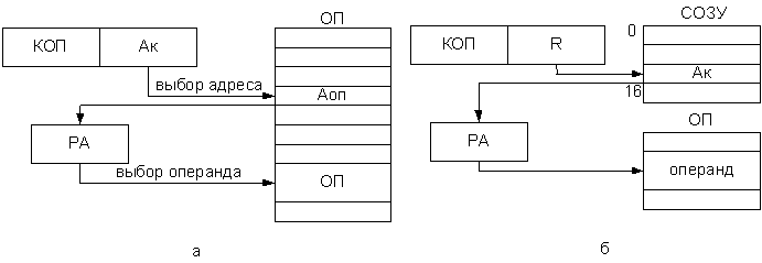 Рисунок 2.5.2- Порядок выборки операнда при косвенной адресации: а- при адресации через ОП; б- при адресации через СОЗУ Такая адресация используется в машинах, имеющих малую разрядность, то есть в мини и микро- ЭВМ. Для адресации операнда требуется как минимум два шинных цикла: 1-й для выборки адреса, второй - для выборки операнда по этому адресу. Часто косвенный адрес хранится во внутренней памяти процессора, состоящей из регистров двойной длины. 2.5.3 Регистровая адресация Регистровая адресация является укороченной. В поле адреса указываются адреса ячеек сверхоперативной памяти (СОЗУ), число которых невелико. Такой способ адресации позволяет сократить длину команды и увеличить скорость выполнения операции, так как СОЗУ является быстродействующей памятью, выполняемой на быстрых регистрах. Эти регистры являются частью процессора и называются регистрами общего назначения (РОН). Следующий рисунок поясняет порядок выборки операндов при использовании 2- х адресной команды: R1- адрес первого операнда, R2- - адрес второго операнда.