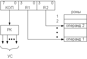 Рисунок 2.5.3- Порядок выборки операндов при регистровой адресации: R1- адрес 1-го операнда, R2- адрес второго операнда