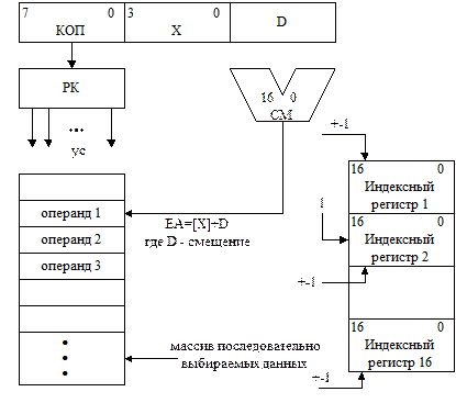 Рисунок 2.5.6-Формирование адреса операнда при относительной адресации Полученный адрес EA=[B]+D называется эффективным или исполнительным адресом. Прямые скобки при B ([B]) – означают, что первое слагаемое EA берется по адресу В. При выборке некоторого участка данных базовый адрес является неизменным. Адресация ячеек памяти относительно базового адреса осуществляется полем смещения. Относительная адресация обеспечивает перемещаемость программ, то есть возможность передвижения программ в памяти без изменений внутри самой программы, что не требует перетрансляции программы. Для назначения новых адресов, изменяется только значение В 2.5.7 Индексная (автоинкрементная и автодекрементная) адресация При обработке больших массивов данных, выбираемых последовательно друг за другом, нет смысла каждый раз обращаться в память за новым адресом. Для этого достаточно автоматически менять содержимое специального регистра, называемого индексным, чтобы выбирать последовательно размещенные данные. Индексный регистр является косвенным. Его загружают начальным адресом массива (специальной командой). Дальнейшая адресация осуществляется путем автоматического добавления или вычитания единицы или шага адреса из его содержимого.
