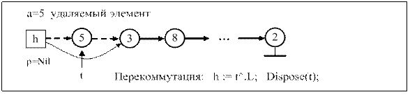 Procedure PrintList (h:u); Begin Writeln; While h <> Nil Do { пока не достигнут конец списка } Begin Write(h^.i:3); {вывод значения текущего элемента на экран} h:= h^.L; {переход к следующему элементу(узлу)} End; End; Замечание. Переменная h в процедуре является локальной (в параметрах она указана без слова Var), поэтому ее изменения не будут касаться глобальной переменной h – головы списка. Удаление заданного элемента из списка сводится к трем возможным случаям: