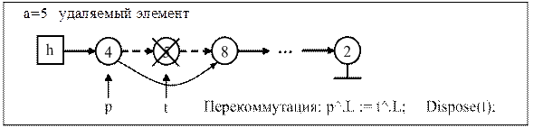 Procedure DelList (Var h:u; a:integer); {a – значение удаляемого элемента} Var p, t:u; { p, t – указатели соответственно на предыдущий и текущий узлы }