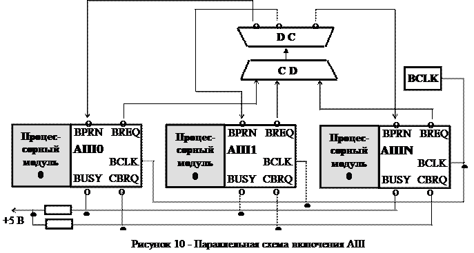 Таким образом, если нескольким арбитрам необходим доступ к шине, то сигнал высокого уровня на выходе ^BPRO у арбитра с более высоким приоритетом поступит на вход ^BPRN соседнего и запретит арбитрам с меньшим приоритетом захватывать системную шину. Арбитры с более высоким приоритетом, не использующие СШ, формируют на выходах ^BPRO сигналы низкого уровня и таким образом предоставляют возможность захватить шину арбитрам с более низким приоритетом. Линии ^CBRQ (общий запрос шины) и ^BUSY (занятость) предназначены для того, чтобы текущий ведущий модуль шины мог освободить шину при поступлении запроса с более высоким приоритетом. Основным недостатком метода является низкое быстродействие на переключение и возможность перегрузки шины (рекомендуется не более трех модулей за период синхронизации шины BCLK). Кроме того приоритет модуля определяется его местоположением относительно модуля с наивысшим приоритетом и является фиксированным. Достоинство - не требует дополнительных затрат оборудования. В схеме с параллельной обработкой приоритетов выходы запроса шины ^BREQi каждого арбитра подаются на приоритетный контроллер, выполненный на основе шифратора приоритетов, выделяющего приоритетный запрос и дешифратора, формирующего сигнал разрешения захвата шины на вход ^BPRNi арбитра (рис.10). Линии ^CBRQ (общий запрос шины) и ^BUSY (занятость) являются двунаправленными и имеют выход с открытым коллектором. Любой ведущий модуль с более высоким приоритетом по линии ^BREQi может получить шину с помощью схемы выделения приоритета. В отличие от ранее рассмотренного метода, одновременно с формированием сигнала ^BREQi арбитр выставляет сигнал запроса на линию общего запроса ^CBRQ. После того, как текущий ведущий шины с более низким приоритетом завершает свой цикл шины, он освобождает шину и снимает сигнал занятости ^BUSY. Запрашивающий ведущий шины, который получает сигнал ^BPRN, формирует сигнал ^BUSY, снимает сигнал запроса с линии ^CBRQ и начинает использовать шину, т.е. состояние линии ~CBRQ показывает на наличие запросов от других модулей с более низким приоритетом. Арбитр шины допускает создание конфигурации, позволяющей устройствам с меньшим приоритетом получать управление шиной, т.е. прерывать обмен модулей с более высоким приоритетом. Для этих целей арбитр имеет два входа: ANYRQST - любой запрос. Если к этому входу подключить +5 В, то при появлении любого запроса на линии ^CBRQ, арбитр освобождает системную шину в конце текущего цикла независимо от приоритета арбитра, запросившего шину (как видно, данная процедура аналогична режиму спецмаскирования при работе ПКП ВН59А); ~CRQLCK - блокировка общего запроса шины позволяет арбитру шины игнорировать сигналы на линии ^CBRQ, т.е. при ^CRQLCK=0 запрещает арбитру освобождать шину любому модулю с более низким приоритетом или просто игнорирует запросы по линии ^CBRQ (имеем режим фиксированных приоритетов ВН59А).
